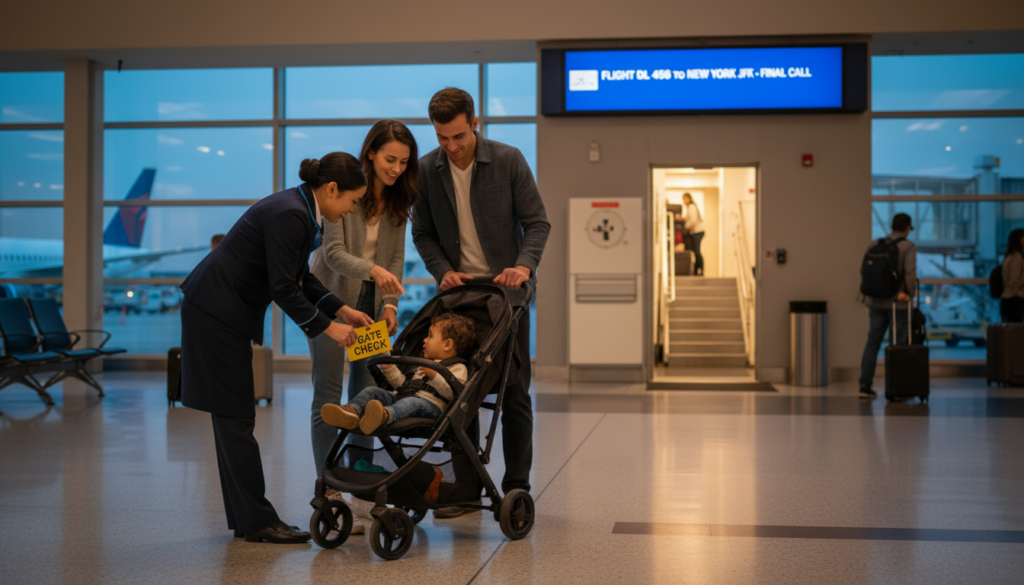Gate check happens during boarding. Airlines allow parents to use strollers inside airports. Staff store gate-checked strollers in the aircraft cargo area.